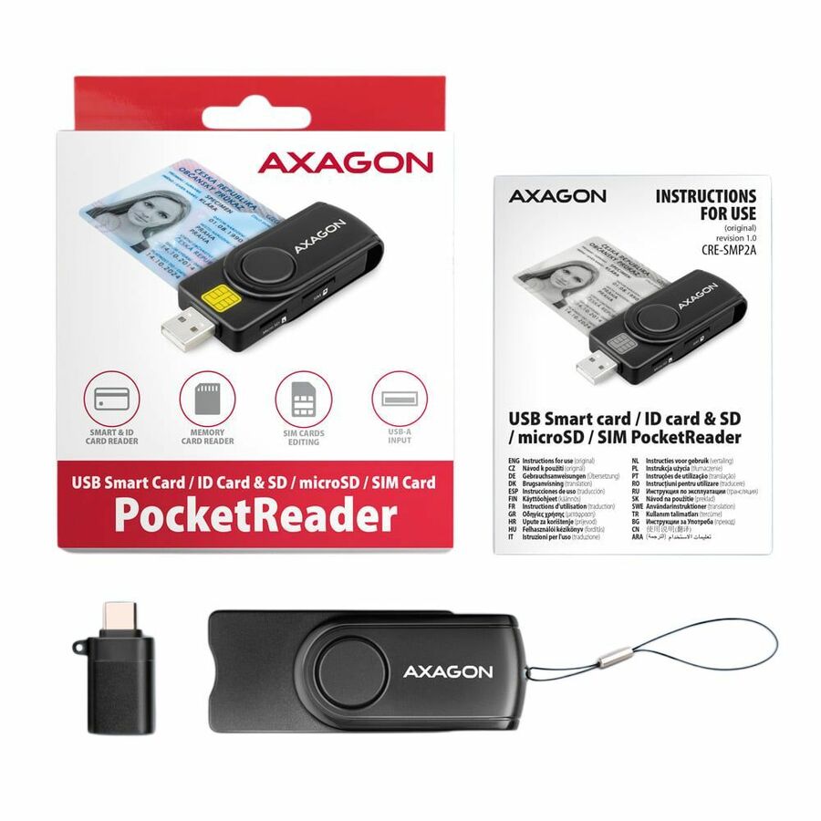 Compact travel desktop smart card / ID card reader AXAGON CRE-SMP2A PocketReader with USB 2.0 interface includes additional slots for SD, microSD and SIM cards. The card reader supports all common contact smart card formats, chip cards and other cards, including contact bank payment cards or contact electronic ID cards . The reader is compatible with most national applications for eID (electronic ID cards).
