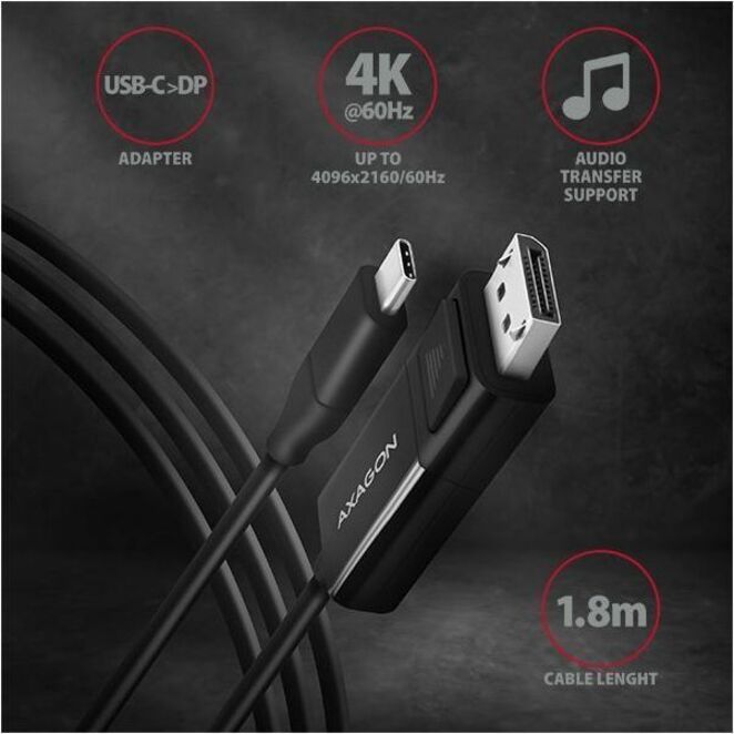 AXAGON 1.80 m DisplayPort/USB-C A/V Cable - Cable for Monitor, TV, Projector, MacBook - First End: 1 x USB Type C - Male - Second End: 1 x DisplayPort 1.2 Digital Audio/Video - Male - Supports up to4096 x 2160