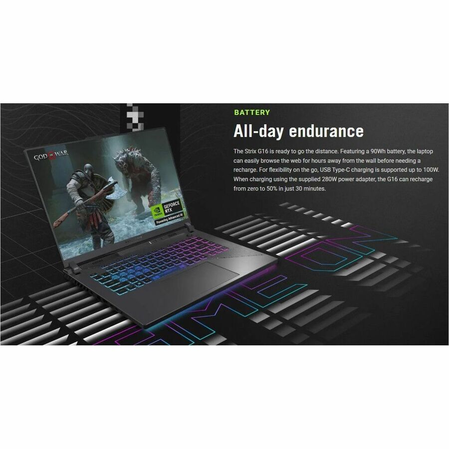 ROG Strix G16 is powered by up to an AMD Ryzen™ 9 processor and up to NVIDIA® GeForce RTX™ 5070 Ti Laptop GPU, AAA gaming is flawless, and streaming is effortless. With PCIe Gen4x4 SSD storage, and one of the slot upgradable storage, and RAM supports up to 64GB, for large game libraries and intense multitasking sessions are a breeze for this gaming machine.